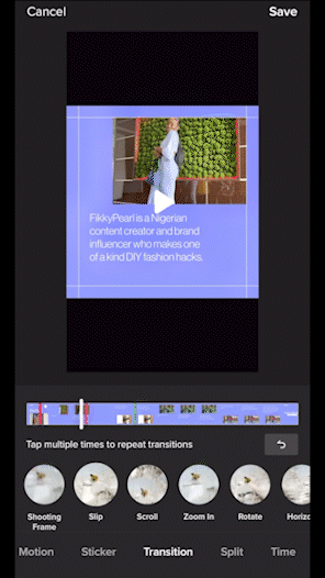 You’ll see a list of transitions with tiny previews of the effect. Just above that you’ll see a mini timeline of your clip. From here, you can either play your video and tap the transition you’d like when the moment occurs, or manually scrub through the timeline to the exact moment for more precision.