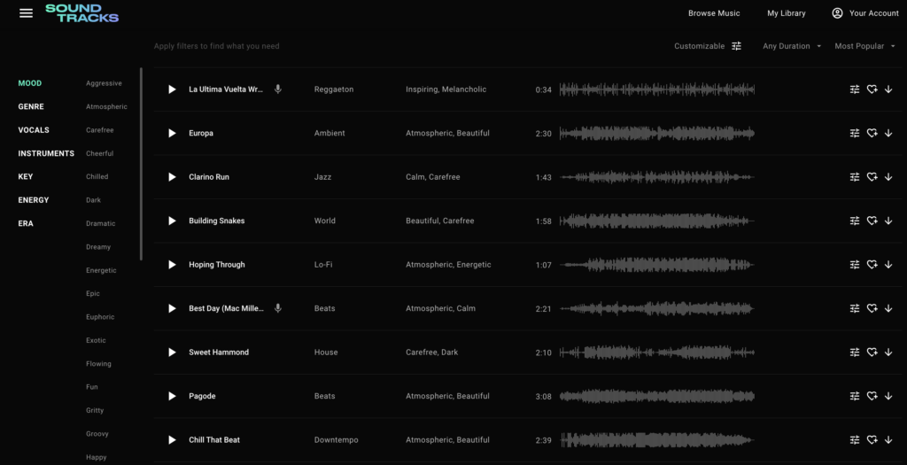 To get started, simply browse through the music library and filter by the criteria that matter most to you. Once you’ve found a track that you like, you can add it to your library, download it, or customize it directly in our app.